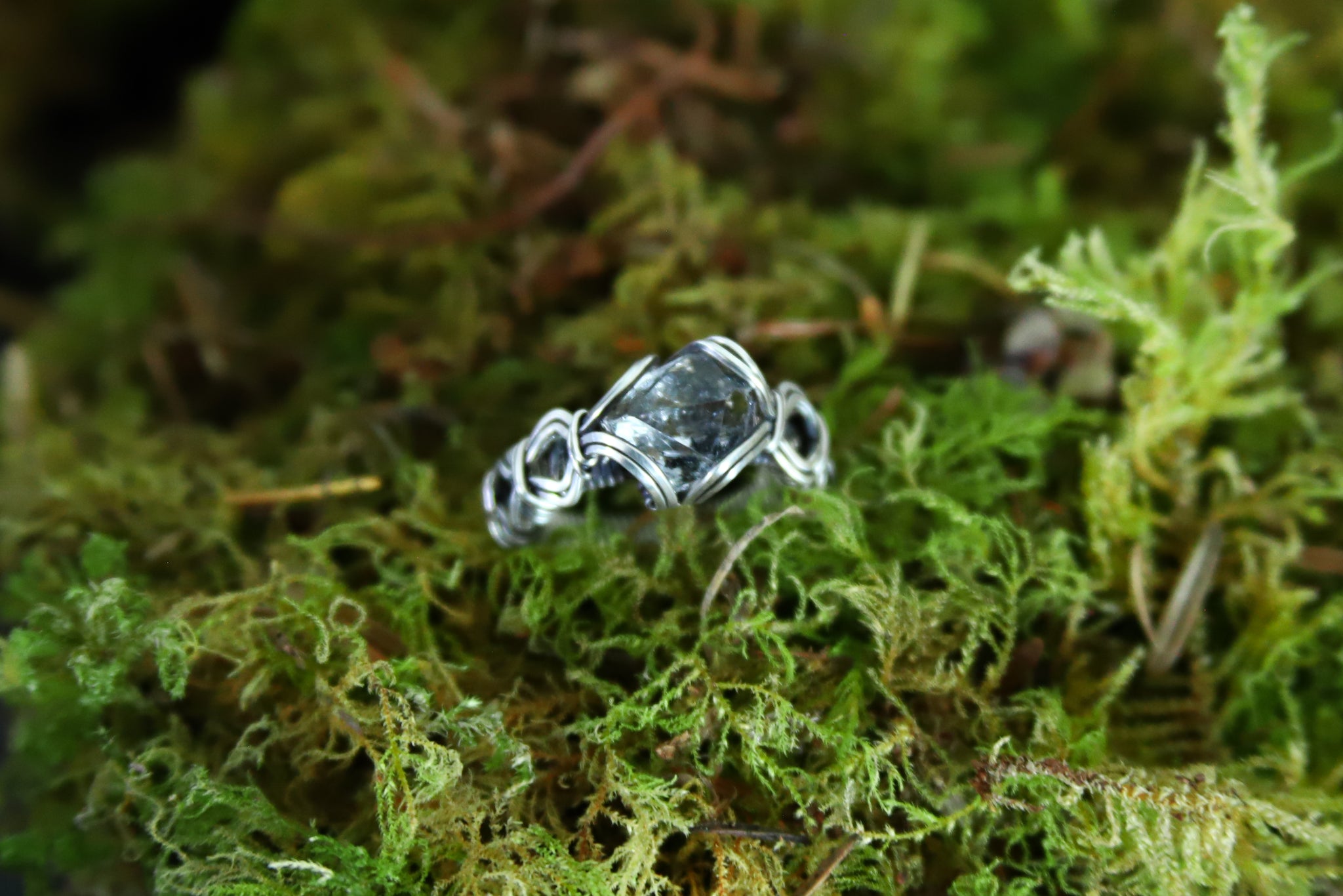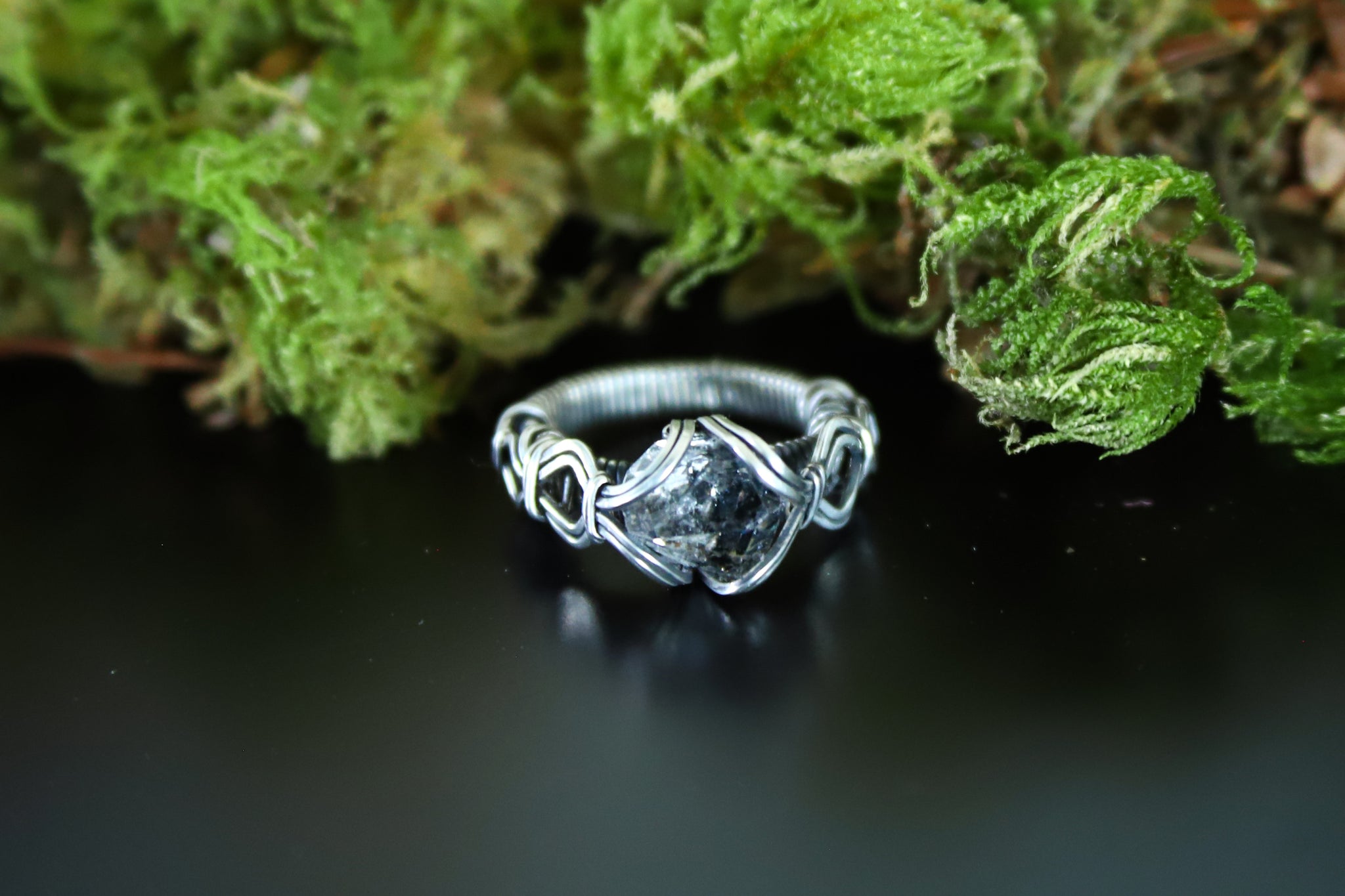 Handmade sterling silver wire wrapped herkimer diamond ring. Size 8 but fits a little snug, great as a pinky ring or statement piece.