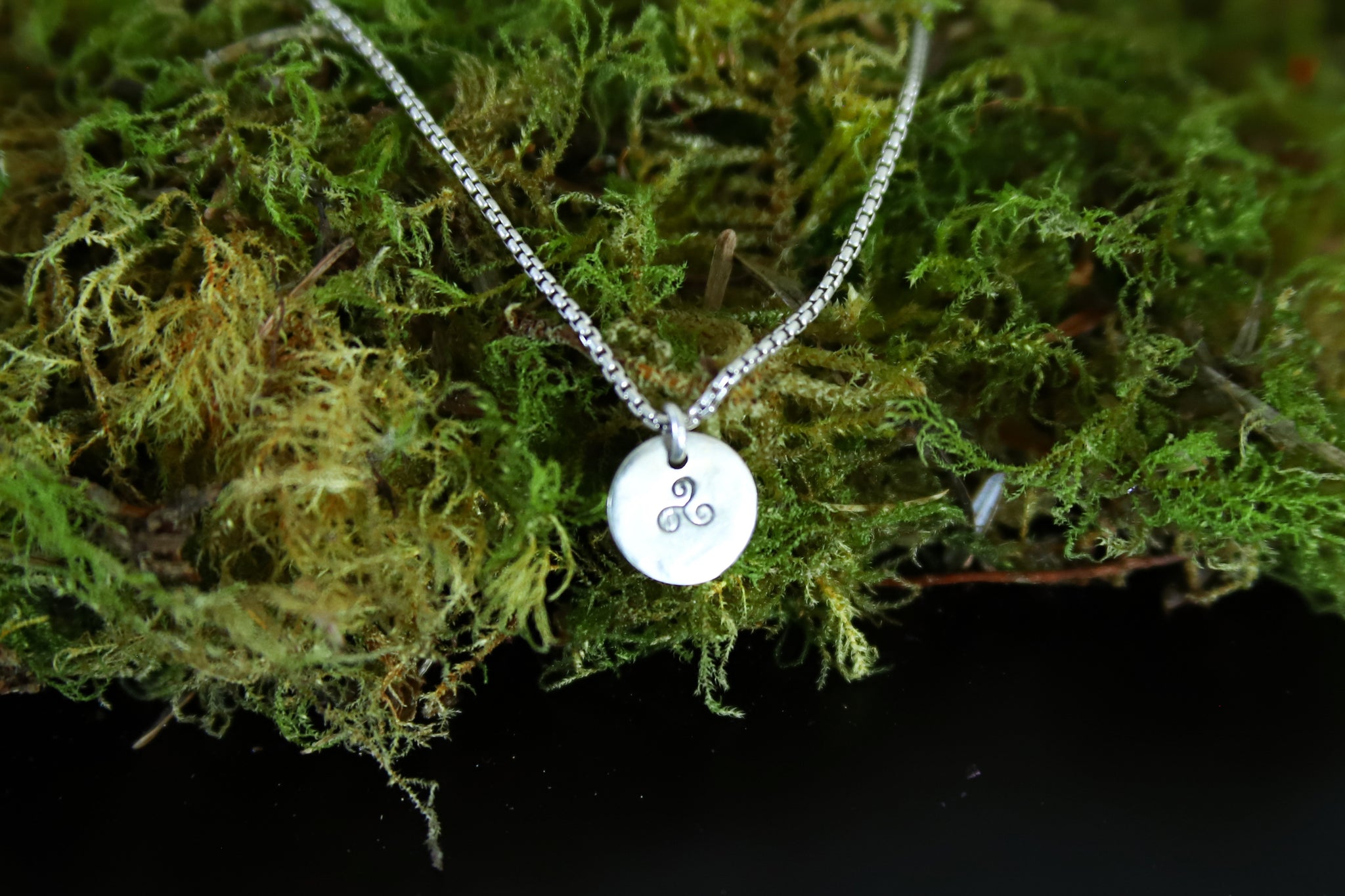 Sterling silver triskele or triple spiral charm on a 13.5" sterling silver chain that will fit most as a choker or just above the collarbones.